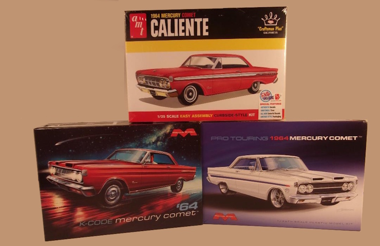 Moebius has released two 1964 Mercury Comet kits: One they label as a "K Code", and the other as a Pro Touring. I wish to discuss the one labeled as a "K Code". In a Ford product, Mustang in particular, the K Code was a 289 V8, a fire breathing, solid lifter, 271 horse 289. For reasons known only to Ford and Mercury hierarchy back in the day, in a Mercury, K Code did not mean the same engine. Comet K Code cars did indeed offer a 289, but allegedly so as to not steal the thunder from the then new Mustang, the Mercury 289, in spite of its K Code designation, was a mild mannered "Clark Kent" version, and not the "Superman" version. Ironically, Mercury called the engine a "Super 289", though its advertised horsepower rating was less than that of two of the 289s that could be had in a Mustang. Corporate politics I guess. The Moebius K Code Comet is in reality a '64 Comet Cyclone, the first year for that little hot rod. I have no idea why the model kit isn't labeled as such; it does indeed include Cyclone emblems for the front fenders, and the open chrome wheels unique to the Cyclone. Another curious thing, in my humble opinion, is the inclusion of only a twin scoop drag racing hood, and not a stock hood. Note: Neither of the new Moebius '64 Comets should be confused with the 'AMT '64 Comet. The Moebius "K Code" kit represents a Cyclone; the AMT kit represents a Caliente. The AMT kit, and the Moebius kit, each represent a different model of the '64 Comet. ![]() -Jim Amado, October 2025