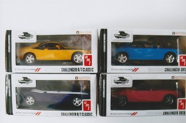 Collectors of “Dealer Promotional” scale model cars have been disappointed in recent years with the seeming demise of this ancient and venerable aspect of our hobby. After toy cars, but long before plastic model kits, the promotional models, commonly called promo’s, were what automobile enthusiasts sought to acquire and admire. Originally intended as a sales aid and/or advertising medium for the auto industry, they spawned an industry of their own due to their widespread acceptance by “kids” of all ages who loved cars. They appealed to drivers and those who were too young to drive. With the automobile industry being the primary customer for these models, and the availability of other mediums which supplanted, and negated the need for, promo’s, they all but faded from the scene. Having been in continual annual production since 1948, it was indeed disappointing to long time collectors who could no longer add accurate scale models of the new cars to their collections. When the auto industry ceased ordering these models, it could have spelled the end, but it didn’t. Some dedicated individuals recognized the “need” for and interest in this type of scale model and kept them alive. In recent years the variety and quantities have been much smaller, and the prices much larger, but we could still add to our collections if we wanted to. Both AMT and Revell in various years offered limited quantities of Corvettes as promo’s in the late ‘90s and into the new millennium. Despite being Corvettes only, there were various colors, body styles, and models of the marque offered. Then Tom Lowe came along to inject new life into various aspects of the model hobby. In 2008 the new Challenger was offered, at the behest of Chrysler Corporation, as a promotional model. This was a “limited run” of 7,000 pieces, according to the box. They were not advertised, showing up on eBay mostly, and were gone fairly quickly. They still appear on eBay now and then. The only color offered was orange. Since then, Corvette promo’s have been “on again off again”, the last annual production bring 2007. We were told there would be no more. Then, after the fact, some more were produced in limited numbers of the 2008, 2009, and 2010 Corvettes. Now, Tom Lowe strikes again! Calling them “predecorated”, and “Showroom Replicas”, rather than “promotionals”, AMT is offering four models of the 2010 Challenger: Detonator Yellow R/T Classic, with black side stripes, and black interior; Plum Crazy R/T Classic with white side stripes, and two tone black & white interior; B5 Blue, with black hood graphic and black interior; Furious Fuscia, with black hood graphic, and two tone black & white interior. These four are more readily available than the Corvette (and rumored new Camaro) promos, which continue to be obscure and from limited sources. There is cause for promo collectors, and anyone who doesn’t build kits, but wants to continue a collection of annual new cars, to rejoice. Thanks, Mr. Lowe! “Keep on keepin’ on!”.