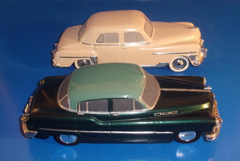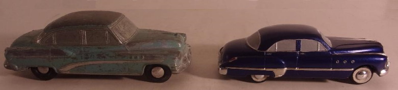 I am a fan of straight eight Buicks. Over their lifespan some were produced in displacements of 233, 248, 263, 320, and 344 cubic inches.The 233 and 344 were discontinued in the thirties, with the 248's final year being 1950, and the 320 marching on into 1952. In 1950 the 263 was introduced and in 1953 it became the last of Buick's straight eights, but only in the Special; other '53 models employed the new for '53 V8 of 322 cubic inch displacement - the first of the "nailheads". Since 1904, Buick made overhead valve engines, a design which they called "valve-in-head". The significance of this is that other auto manufacturers continued to produce flathead (side valve, or valve in block) engines into the mid 1950s, and beyond in some cases. While the OHV engine is superior to the flathead, the Buick straight eight design was not ideal, in that it had siamese ports. The intake and exhaust ports were on the same side of the engine, requiring some cylinders to share an intake runner (the Buick had four), while the exhaust had eight. It's common knowledge that a cross flow head is better for optimum performance, it is also more expensive to produce. Buicks also had only five main bearings. While I am unaware of this being a problem in any of the Buick in lines, some straight eights, Packard in particular, had nine main bearings. Stronger, theoretically better, but also heavier. In spite of the siamese ports not being the best design for performance, the Buick straight eights were not only dependable and reliable, but also innovative in other ways. For example, in 1938 Buick's then largest engine, the 320, was installed in their lightest car, thus creating the Buick Century, so named because it was capable of attaining 100 mph. In 1941 and '42, Buick offered "Dual Compound Carburetion"; two stromberg two barrel carburetors. The set up included a split exhaust manifold, each half drawing from four cylinders, but dumping into a single header pipe. Compound Carburetion was standard on some models, and optional on others. The 320 engine in the big cars was rated at 165 horsepower with the dual carbs. Cadillac in that same period had 150 hp from its flathead V8. WWII crashed the party, and the immediate postwar era saw mostly warmed over transportation to satisfy the car hungry populace, but it included some new makes and models as well. Kaiser was new, and Studebaker was radically restyled. Kaiser unfortunately didn't remain ten years, in spite of some unique and practical offerings. Studebaker continued to progress to an OHV V8 in 1951, and a knock-em-dead restyle in 1953. In the meantime, Buick was not asleep. In 1952 a Buick engineer named Braun gave us the four barrel carburetor, which appeared on the 320 straight eight. It was a year later, in 1953, that other manufacturers began to offer 4 barrel carburetors, and also in 1953 Buick offered their first modern V8, as previously mentioned. HOW THIS RELATES TO SCALE MODEL CARS I told you all that, so I could tell you this: National Products division of Banthrico Industries made the '49 Buick Super 4 door sedan promotional in 1/31 actual size in the medium of slush cast pot metal. In 1950 they made the Buick Super (model 51) 4 window, 4 door sedan (121.5" wheelbase) in 1/30 actual size. As mentioned elsewhere, They were apparently contemplating doing the '50 in a larger scale (See "One Hit Wonders" under "promo perspective"), but ultimately did not. 1951, for reasons unknown to me, saw no Buick scale model made, in any scale. In 1952 Banthrico produced the Buick 4 door six window sedan (125.6" wheelbase) in alleged 1/25 scale, which was becoming the standard model car industry scale. The model supposedly represented the Roadmaster, which was at that time, the top of the line Buick, with four simulated port holes on the front fender. The flaw in the operation being that the Roadmaster used the 320 cube straight eight, then Buick's longest engine, and thus the front clip of the model was too short to accurately represent the Roadmaster. It would, however, accurately represent the Super, which used the 263 in line eight.. So the Charcoal and gray '52 in the accompanying photos was altered by removing one of the fender "port holes", and thus more accurately representing the mid line Super. The maroon model in the photos, also began life as a '52 "Roadmaster", and was likewise changed by removing one "port hole", and further modified by altering the side chrome trim, and removing the rear fender chrome "fins", to resemble the '51 Buick Super, thereby resulting in a reasonably accurate replica of the "missing" year. The light blue and white model is a Banthrico '53 Buick, and somewhat accurately represents the 4 port hole Roadmaster, which would have used the then new 322 V8, which was obviously shorter in length than either straight eight...even though visibly the distance between the front edge of the front door, and the rear edge of the front wheel opening is still too short. All of this means nothing to most people, but it may mean something to some, so for that potential reason it was presented. Jim Amado We borrowed that term from the record industry, where it referred to a singer or a group that had one song that made it onto the charts,