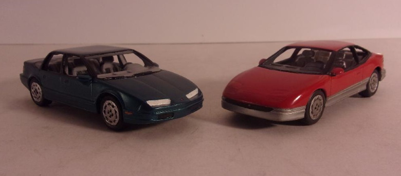in the same scale. A few short years, later in 1991, GM contributed to their own bankruptcy by adding yet another car line to their repertoire when they foisted the Saturn upon the car buying public. They also offered promotional scale models of two Saturn models, again in pewter, and again in 1/36 scale. The suggested retail price for each was $89.95, and allegedly only 500 of each were made. Unfortunately, it is known that more than 500 were made. In my opinion, not only were they over priced, but they suffered miserably in detail. One thing that made Saturn four door sedans (and Oldsmobile clones) interesting was the wrap around back light, which is quite conspicuous in its absence in the pewter models.